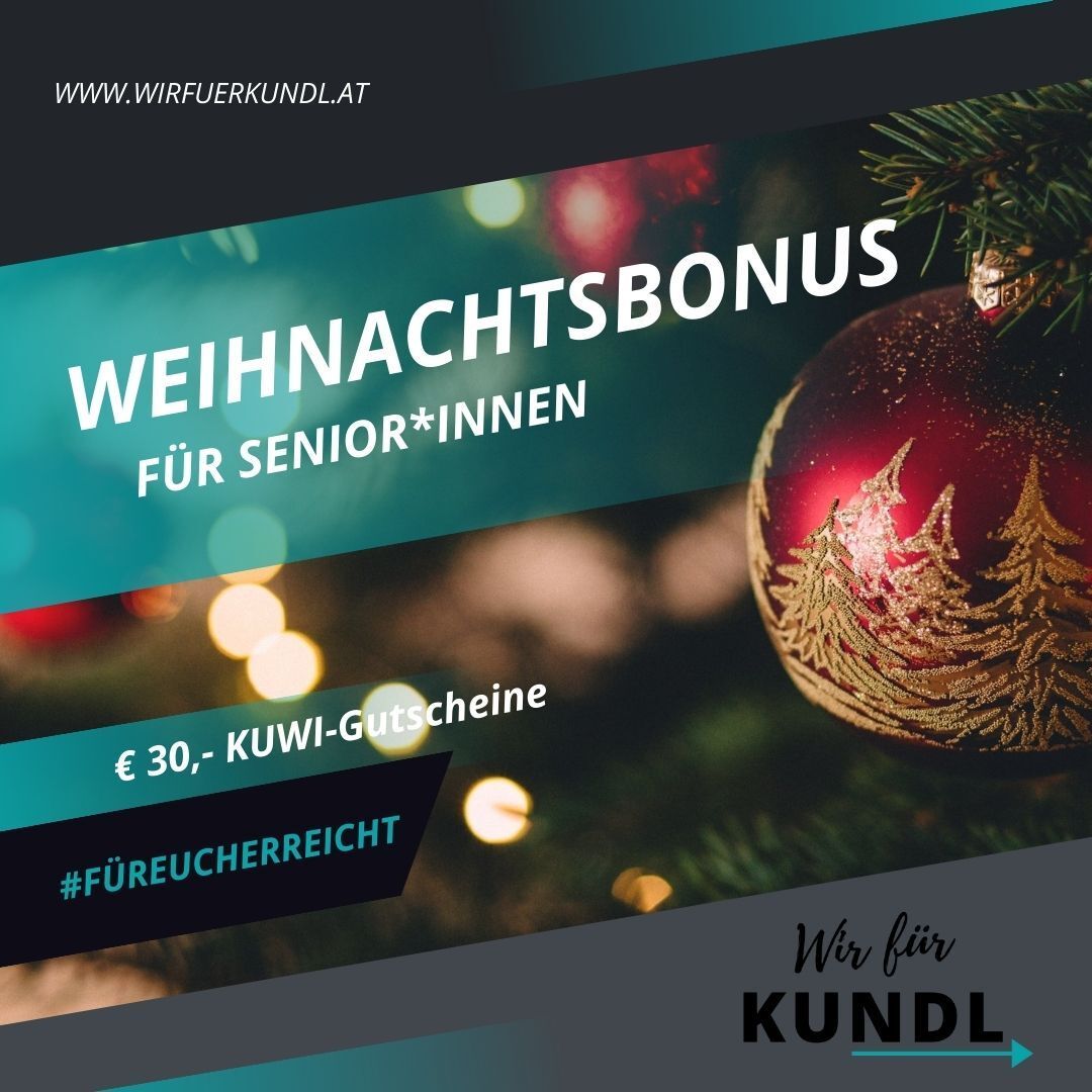 Pandemiebedingt musste die allseits beliebte Weihnachtsfeier für unsere Senior*innen und Pensionist*innen bereits das zweite Jahr hintereinander abgesagt werden. Wir haben uns bei der letzten Gemeinderatssitzung Anfang Dezember gemeinsam mit den Kundler Frauen dafür stark gemacht, dass als kleine Entschädigung ein Weihnachtsbonus in Form von KUWI-Gutscheinen ausbezahlt werden soll. Bei der Sitzung selber konnte sich die Bürgermeisterpartei nicht dazu durchringen, gleich ihr OK dazu zu geben. Zwei Wochen später wurde allerdings dann doch noch ein Umlaufbeschluss gefasst, diese Aktion durchzuführen. Damit hilft man jetzt gleich doppelt: Unsere Senior*innen freuen sich über einen Weihnachtsbonus von € 30,- in Form von KUWI-Gutscheinen und die heimischen Wirtschaftsbetriebe, welche von der Pandemie ebenfalls teils schwer getroffen worden sind, freuen sich über zusätzlichen Umsatz.